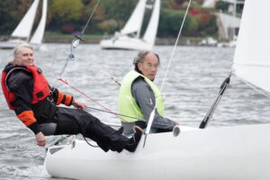 Am Sonntag war dann wieder um 11 Uhr das erste Ankündigungssignal auf dem Wasser. Der Himmel war bedeckt und der Wind mit 1-3 Bft. nicht ganz so stabil wie am Vortag. Wir konnten die zwei noch ausgeschriebenen Wertfahrten durchführen, bis wir dann um 15 Uhr bei Nieselregen vom Wasser kamen. Schnell umgezogen sind wir dann mit dem Auto noch rechtzeitig zur Siegerehrung im BYC angekommen.